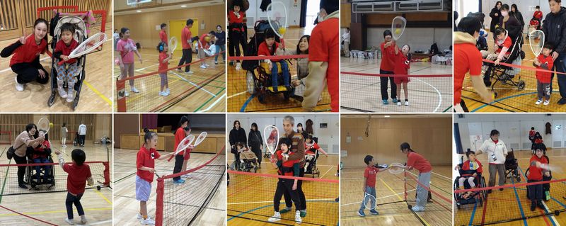 テニスで子ども達の 出来た!伝わった!嬉しい!楽しい! → 自己肯定感 → いろいろなことにチャレンジ!する気持ちを育みます 「テニスにチャレンジ!」 「外出にチャレンジ!」 「新しい友達作りにチャレンジ!」 どんな障がいでも大丈夫です。きょうだい児も一緒に! 安全安心のスポンジボール・扱いやすい専用ラケットを用意しています。 いつもの運動の準備でいらしてください。 必ずラリーが出来るようにサポーターがお手伝いします!!! 1回だけラリーをして帰っても構いません。 たくさんのボールをつなげましょう。 慣れてきたら試合にチャレンジ! |